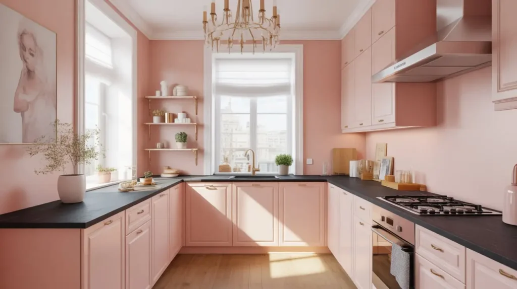 Ready for something totally unexpected and incredibly chic? Pair your black countertops with soft, dusty blush pink walls. I know, I know, it sounds… different. But trust me on this one.