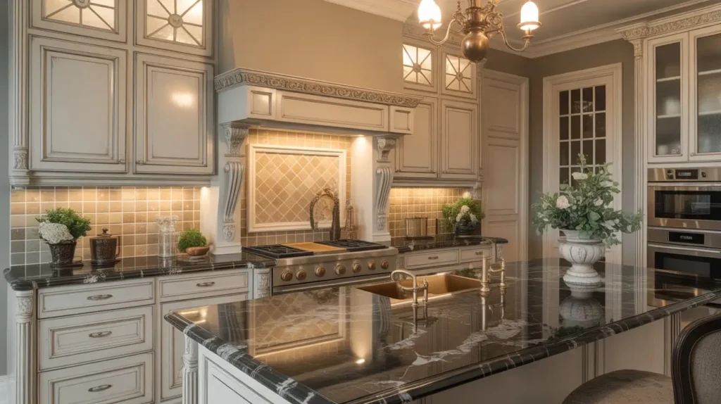 Pairing cream-colored cabinets with a stunning black marble countertop, like Nero Marquina with its dramatic white veining, creates a look that is classic, elegant, and full of warmth. It feels like a luxurious Parisian apartment—timeless and effortlessly chic.