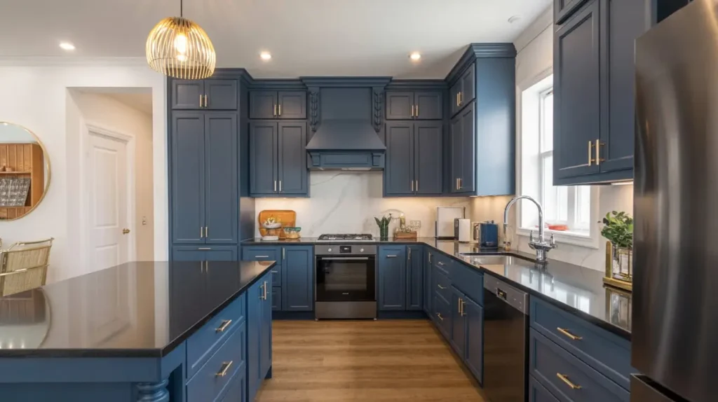 This is another low-contrast pairing, but unlike the matte grey and black, this one is all about shine. A polished black quartz or granite countertop reflects light and adds a layer of glamour that complements the regal nature of navy blue.