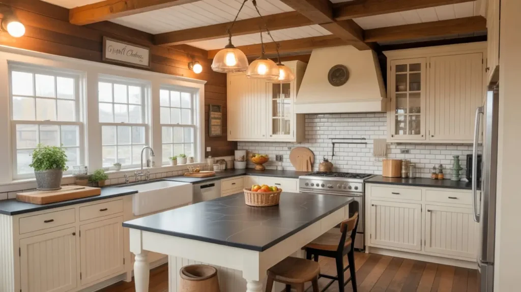 • Key Elements: An apron-front sink is practically a requirement. Shiplap on the walls or island is another signature move.