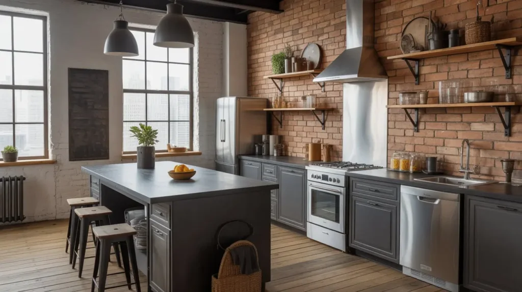 • Lighting: Think factory-style pendants with exposed Edison bulbs or track lighting to complete the look.