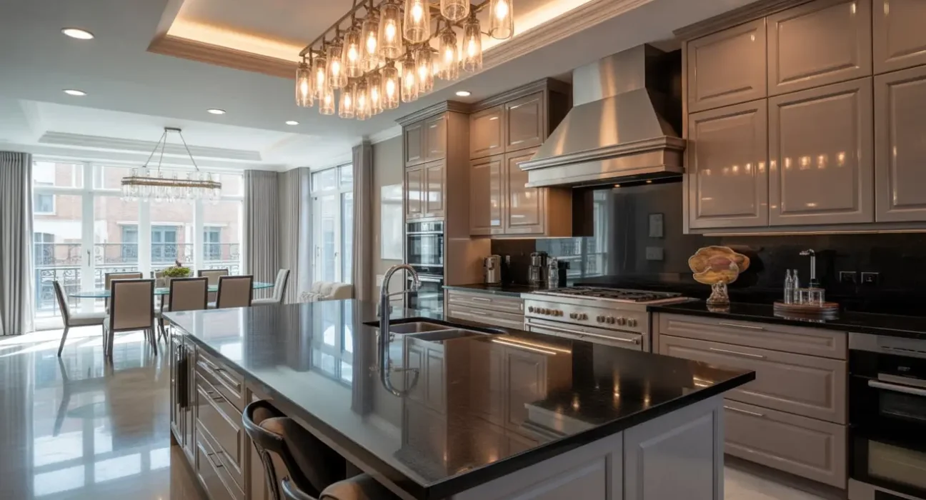 7. Luxury Kitchen with High-Gloss Black Granite