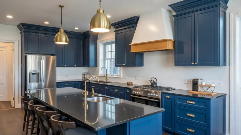 - Hardware is the Jewelry: Brushed gold or brass hardware is the perfect complement to a navy and black kitchen. The warm metal pops against the cool, dark tones and adds a necessary touch of brightness and luxury.