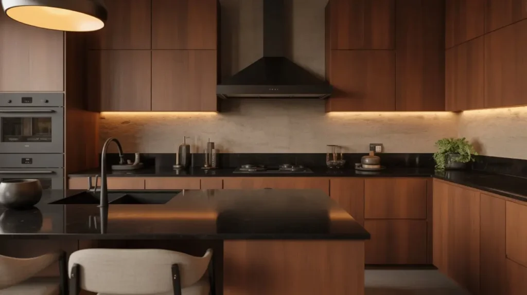 This works especially well in kitchens that aim for a “modern rustic” or “Japandi” (Japanese-Scandinavian) aesthetic. It’s clean and minimalist but also deeply warm and human. I love how the wood grain adds a layer of visual interest that prevents the black granite from feeling flat or monolithic.