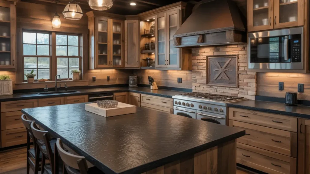 - Warm Metal Accents: Oil-rubbed bronze or copper hardware and fixtures are the perfect complement to a rustic kitchen. Their warm, aged patina works beautifully with the wood and the textured black stone.