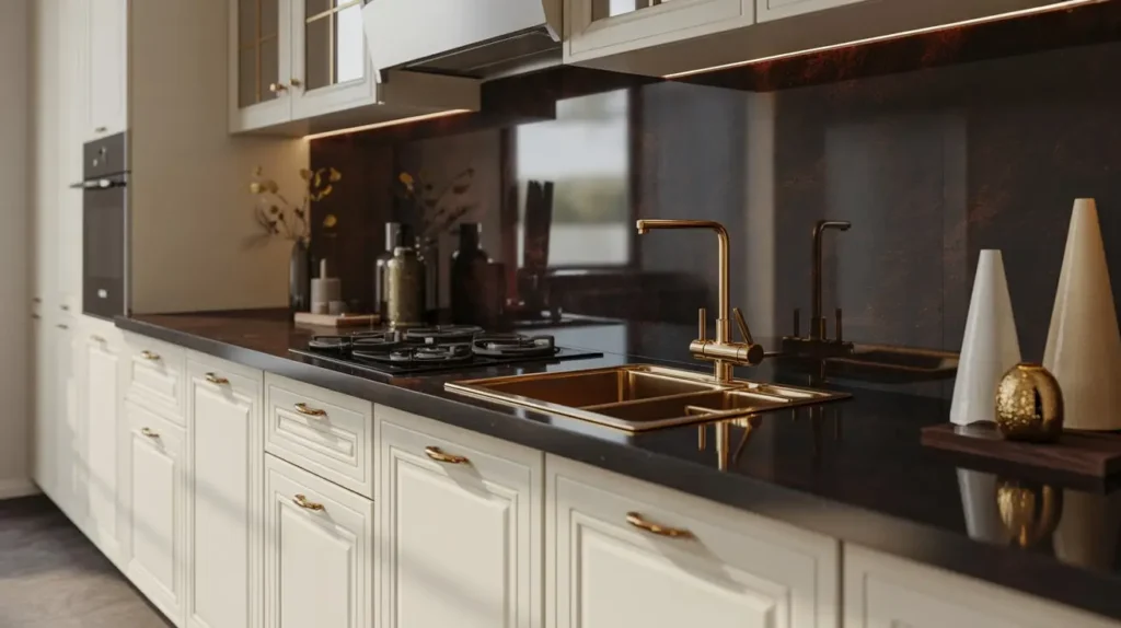 - Granite Finish: Both polished and honed black granite work beautifully here. A polished surface will reflect the gold, amplifying the glamour. A honed surface will provide a soft, matte backdrop that makes the gold hardware really pop.