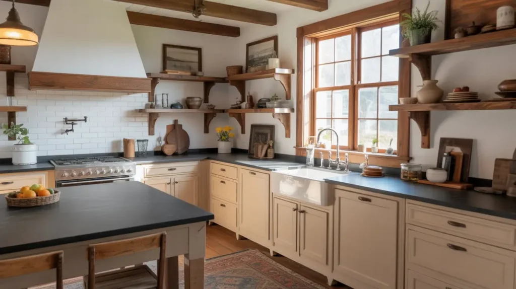 If the modern farmhouse look is a bit too polished for you, and you crave something more rugged and textural, then a rustic kitchen with leathered black granite is calling your name. This is all about celebrating raw, natural materials and creating a space that feels warm, lived-in, and full of character.