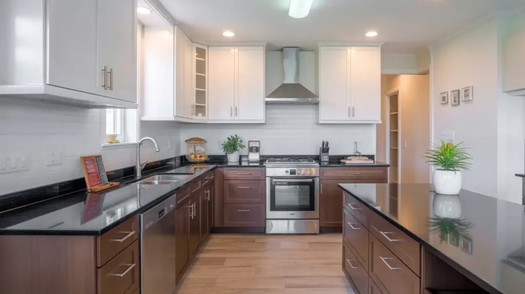 15. Two-Tone Kitchen Featuring Black Granite Contrast
