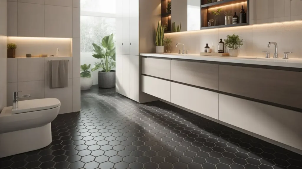 Ultimately, the floor is your canvas. A black hexagon tile floor doesn’t just hold your vanity; it makes a statement the second you walk in the door.