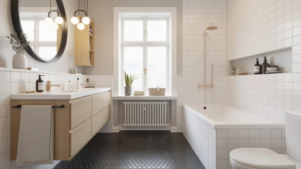The key to a Scandinavian-inspired bathroom is balance. Use the black hexagon tiles on the floor as a graphic foundation, but keep everything else bright, airy, and natural.