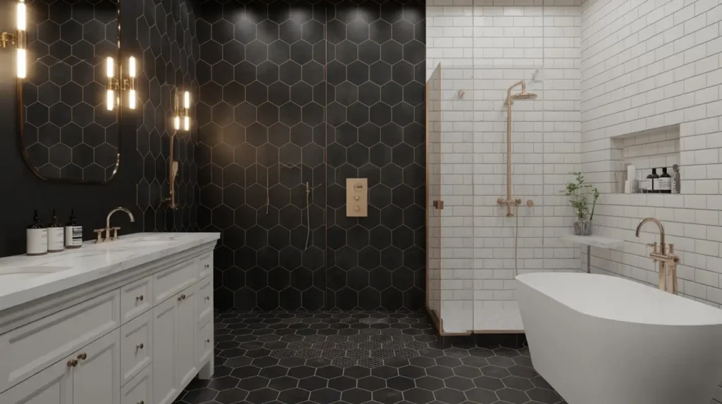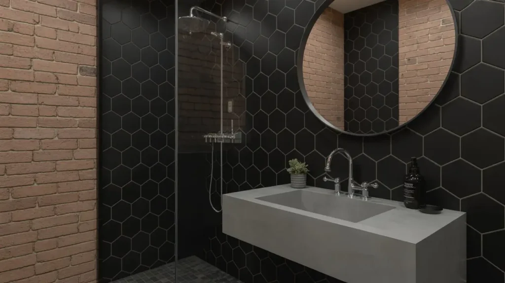 Another brilliant spot for an accent wall is inside the shower. Imagine stepping into a shower enclosed by clear glass, with a stunning wall of black hexagons as the backdrop. It feels incredibly luxurious and custom. This is a great way to define the shower area as a distinct zone within the bathroom.