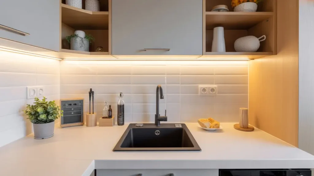 In a small kitchen, you often don’t have space for a lot of decorative flair. So, you have to make your functional elements work harder. A black sink acts as a powerful design anchor. It draws the eye, creates a point of interest, and adds a touch of luxury that can elevate the entire space.
