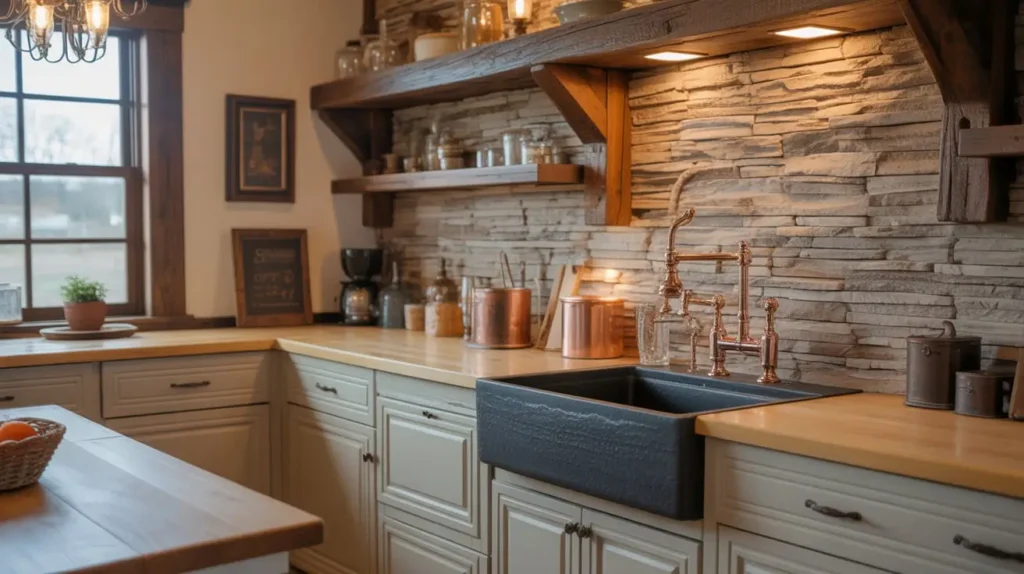 This look sings when paired with other rustic-meets-modern elements. Think butcher block countertops for warmth, open shelving with black metal brackets, and a subway tile backsplash (maybe with dark grout to tie in the sink).