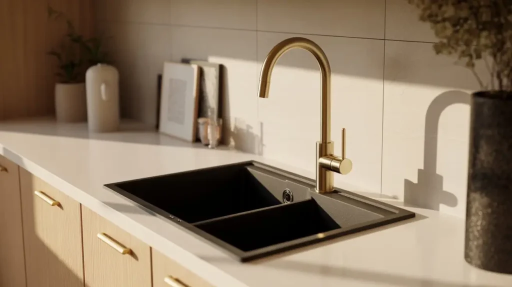 Brass has a warmer, deeper, and often more “living” finish than polished gold. It can develop a beautiful patina over time, adding character to your kitchen. When you set that warm, evolving metal against the static, deep black of the sink, the effect is just… perfect.