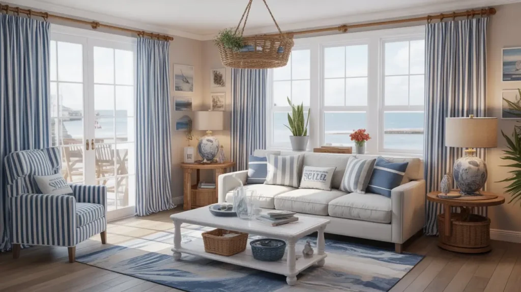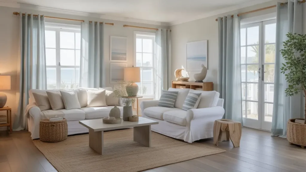 - Color Palette: Build on the coastal theme with sandy beiges, crisp whites, and soft grays. You can add pops of coral or a deeper navy in your throw pillows for a bit of contrast.