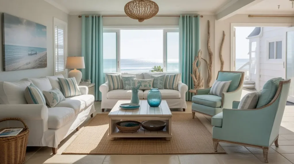 - Furniture & Decor: Light-colored slipcovered sofas, rattan chairs, jute rugs, and art depicting seascapes or abstract water scenes will complete the look. It’s all about feeling casual and comfortable.