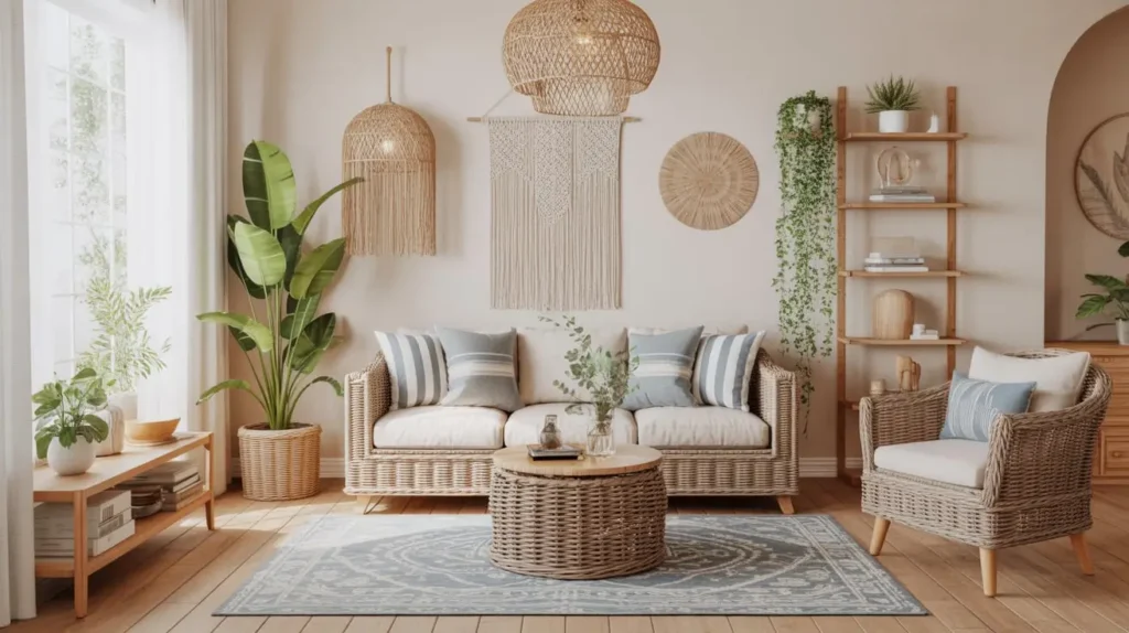 - Furniture: A statement rattan armchair (like a peacock chair), a cane-front media console, or a woven wicker coffee table.