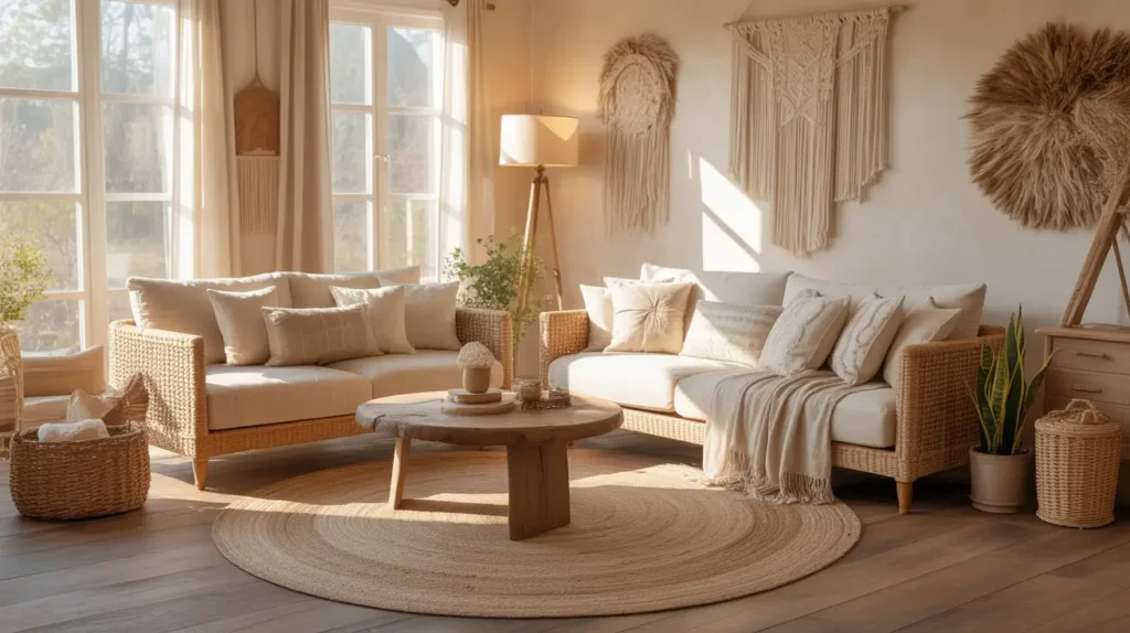 - Textures: This is where the magic happens. Layer jute or sisal rugs, chunky knit throws, linen curtains, and pampas grass in ceramic vases.
