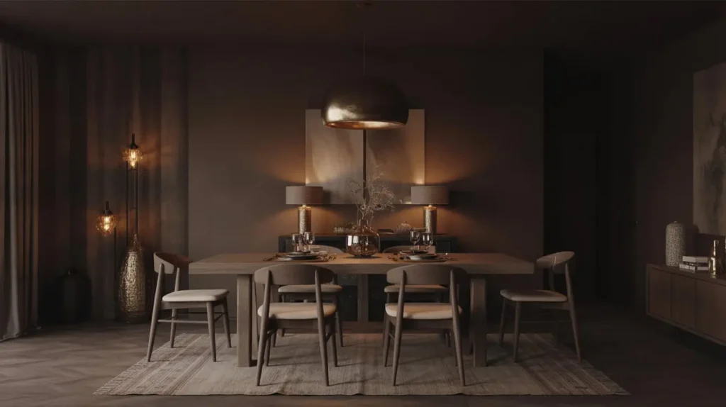 • Strategic Lighting is Key: With dark walls, lighting is everything. You’ll want multiple sources of light. A dramatic chandelier or pendant light over the table is a must, but also add sconces, table lamps, and plenty of candles to create a warm, layered glow.