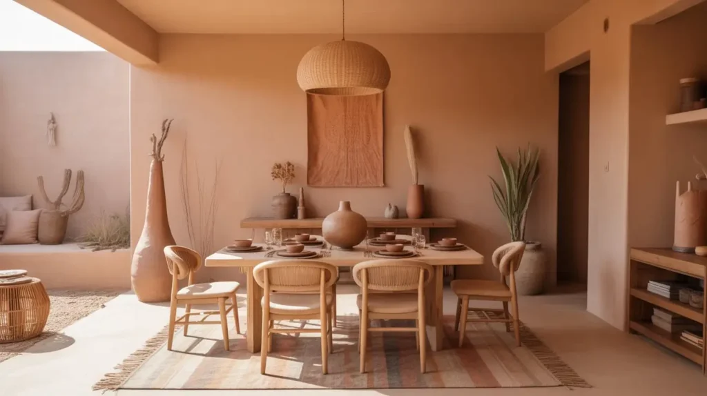 Take a trip to Joshua Tree or Marfa without ever leaving your home. The desert-inspired boho dining room is all about capturing the warm, sun-baked colors and rugged textures of the desert landscape. It’s an incredibly warm and inviting style that feels both earthy and modern.