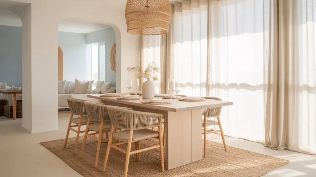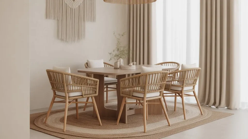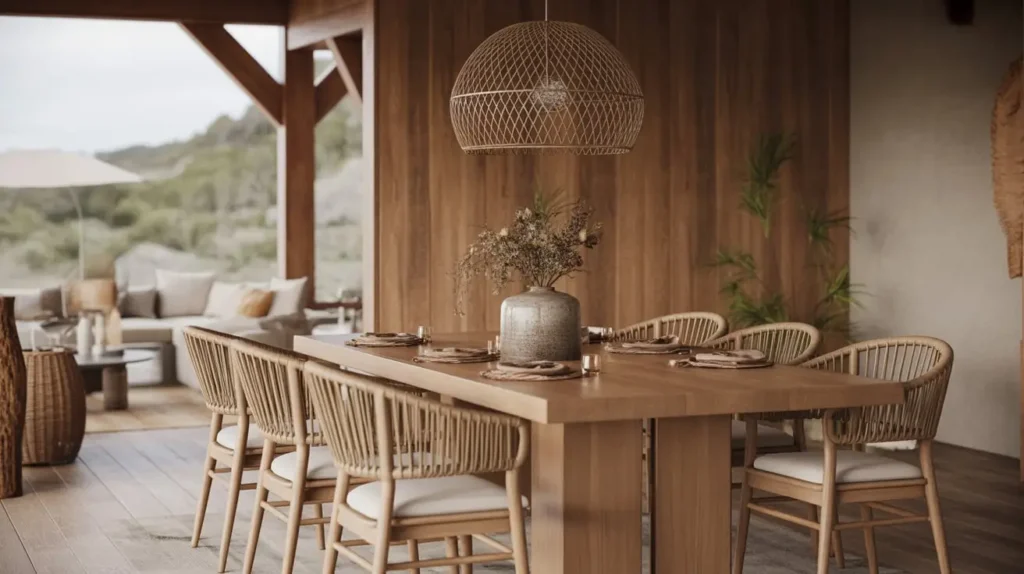 • Rattan, Rattan, and More Rattan: Rattan is your best friend here. Use it for your dining chairs. There are so many amazing styles out there, from the classic bistro chair to more modern, sculptural designs. A large rattan pendant light hanging over the table is also a non-negotiable for this look.