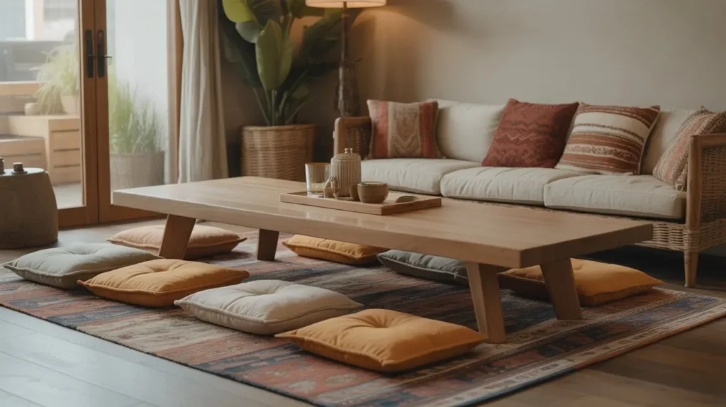 • The Low Table: The centerpiece of this space is a low-slung coffee table or a dedicated low dining table. You can find these online, or you could even DIY one using a slab of wood and some short legs.