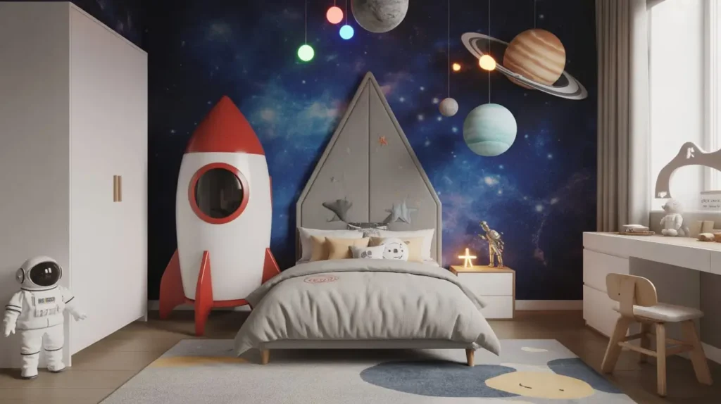 If you want to blow your kid’s mind, start with the universe. A space adventure theme offers infinite possibilities because, well, space is infinite. But don’t just slap some star stickers on the ceiling and call it a day. You need to create an atmosphere.