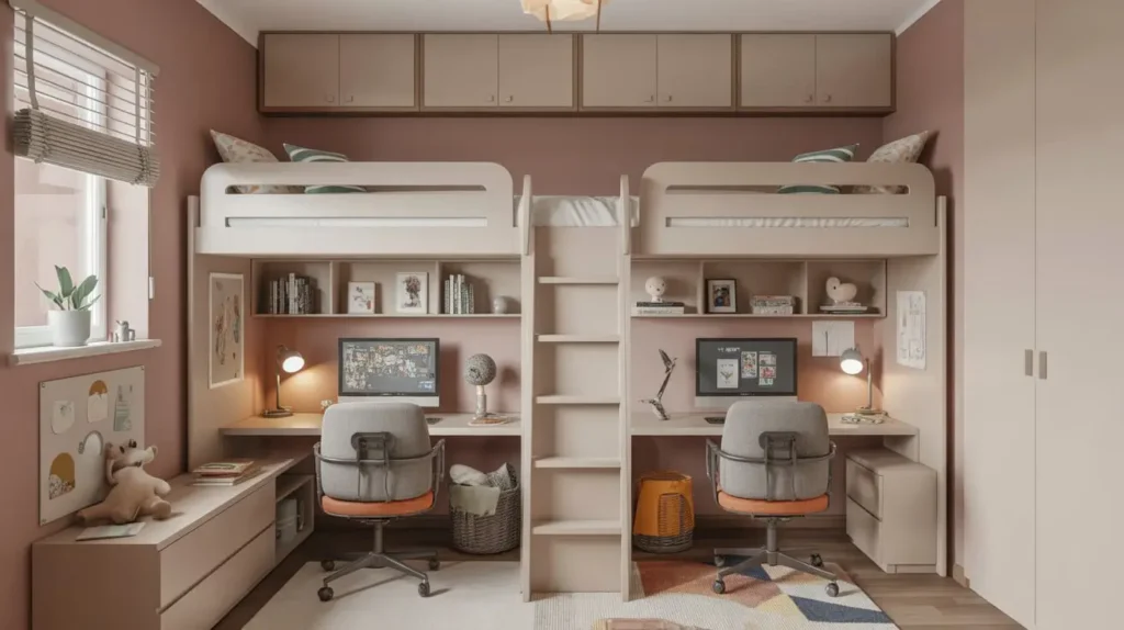 Two single loft beds can face each other with a shared desk counter running between them, or each bed can have its own distinct desk area beneath. The elevated sleeping positions create a sort of bedroom within a bedroom, giving each child their own elevated retreat.