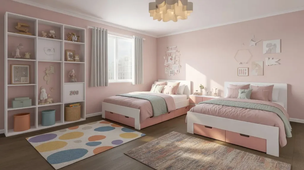 The trick is choosing dividers that don’t completely block light from windows. You want separation, not a dungeon atmosphere. Sheer fabrics or open shelving keep the room feeling airy while still giving each child their designated territory.