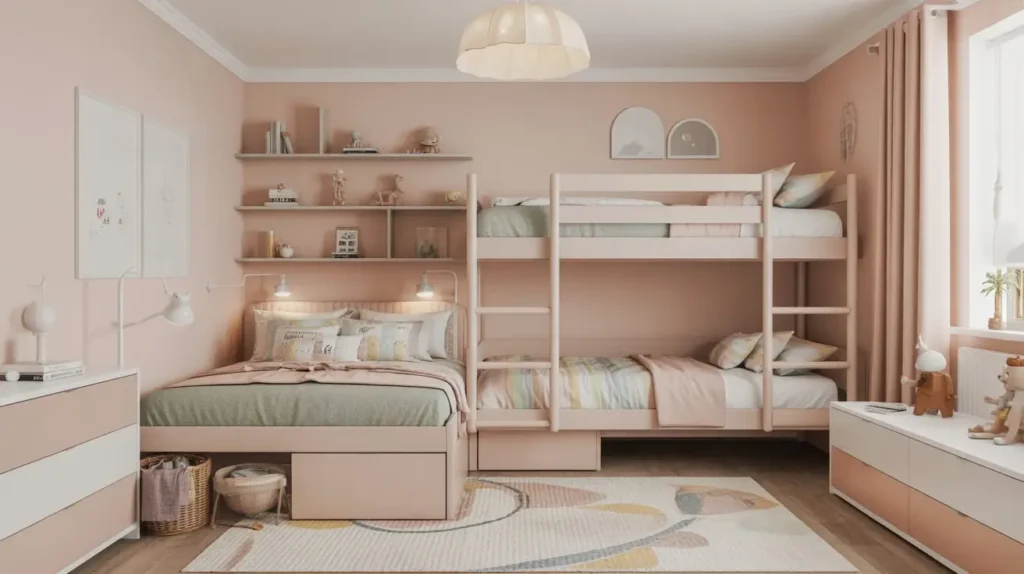 The beauty of a well-planned bunk bed layout is that it opens up valuable floor space for play areas, desks, or storage—all of which you’ll desperately need in a shared room.