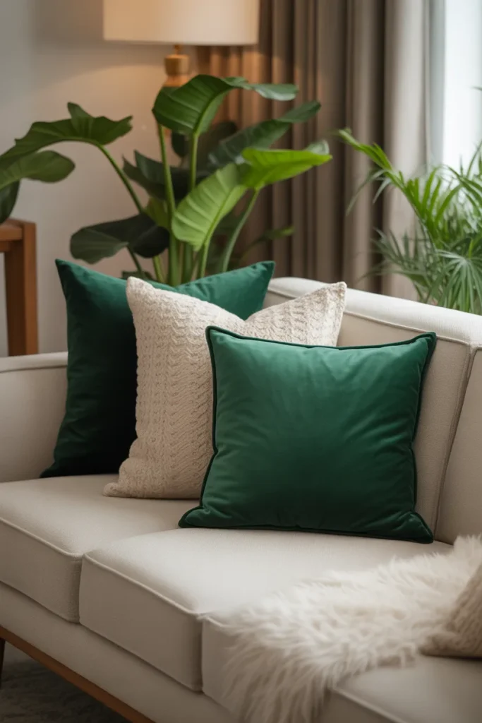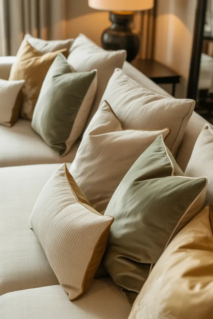 Imagine deep olive or sage pillows paired with soft cream ones. It feels fresh but still grounded.