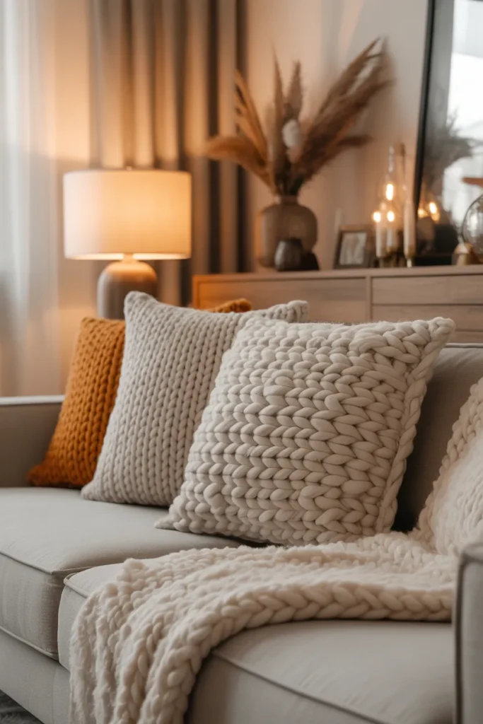 Chunky knit pillows mixed with soft fabrics create that warm, inviting winter vibe.