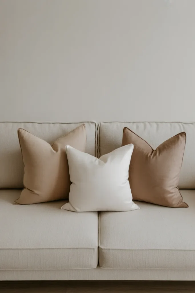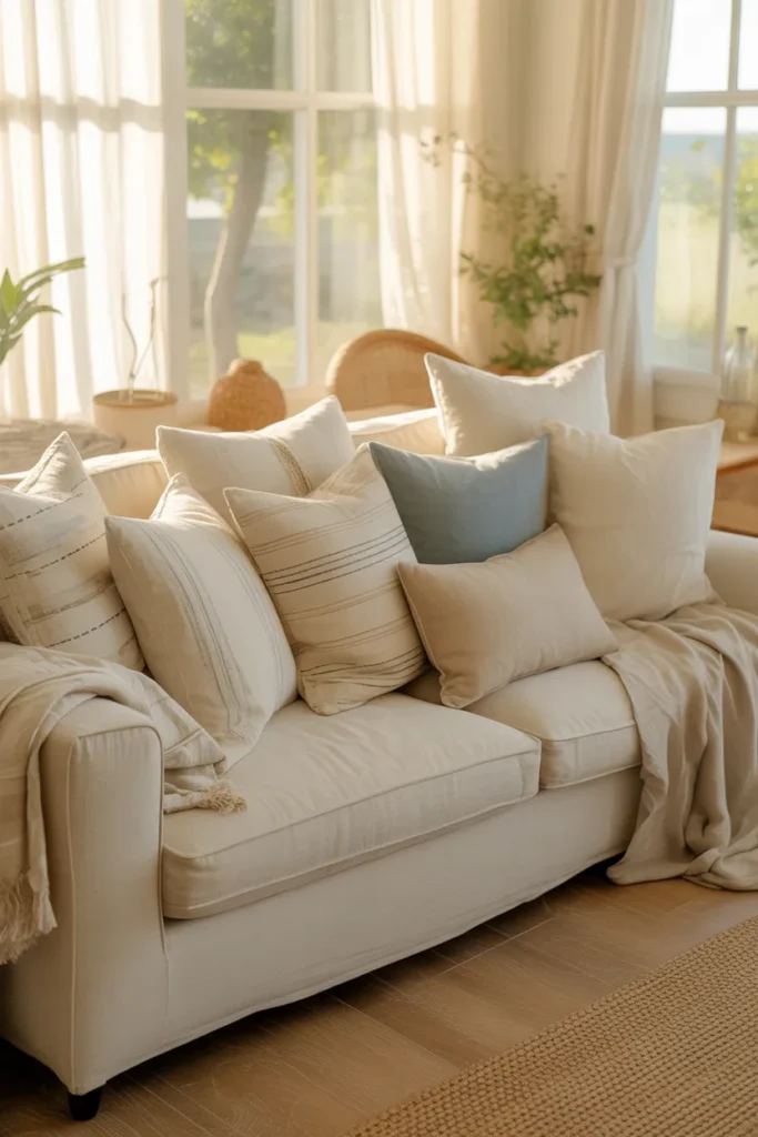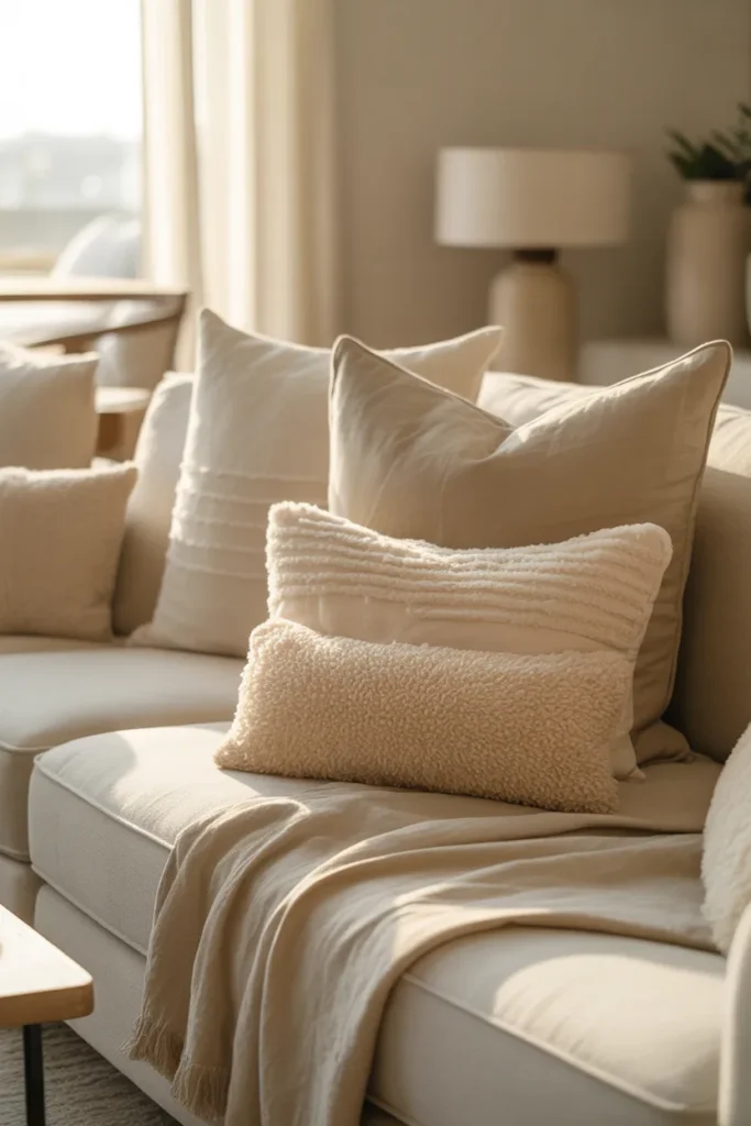 Picture a couch bathed in afternoon sunlight, with soft beige and creamy white pillows stacked casually but intentionally. The whole setup feels calm, almost like a luxury hotel lounge where everything is quiet and perfectly styled.