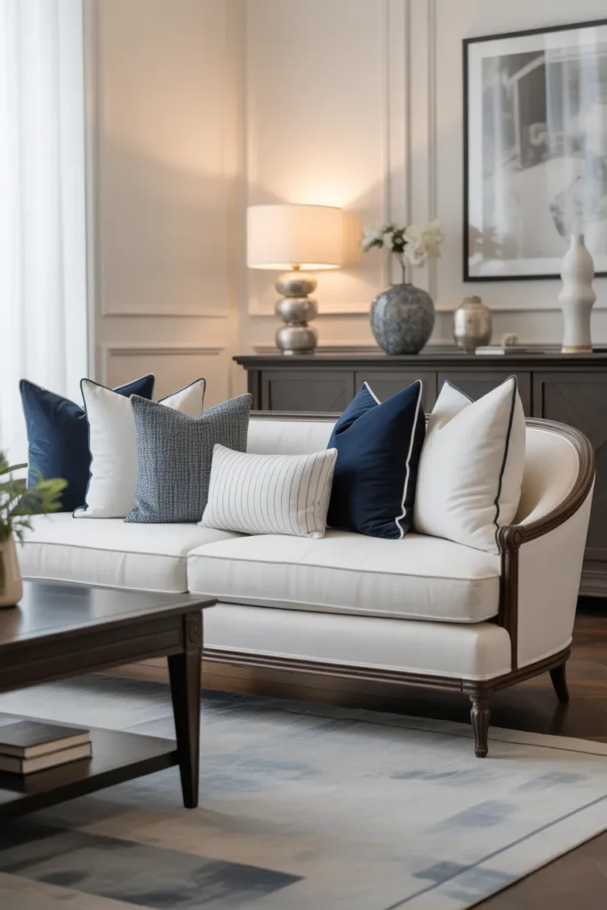 - Add navy pillows with subtle patterns