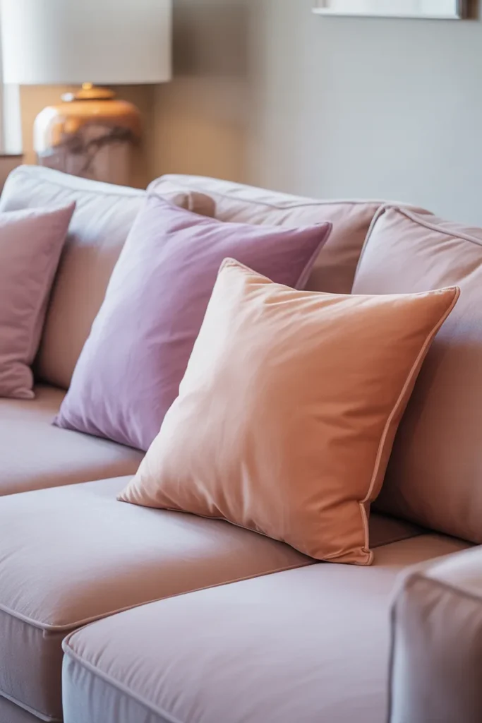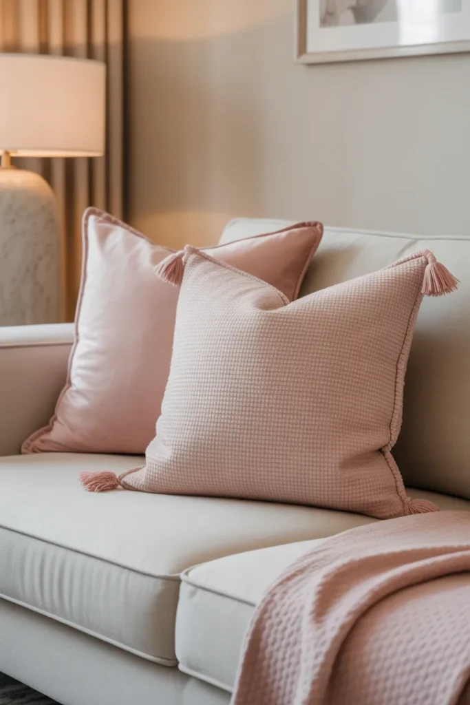Muted pink paired with beige creates a gentle, inviting look. It works well in both living rooms and bedrooms.