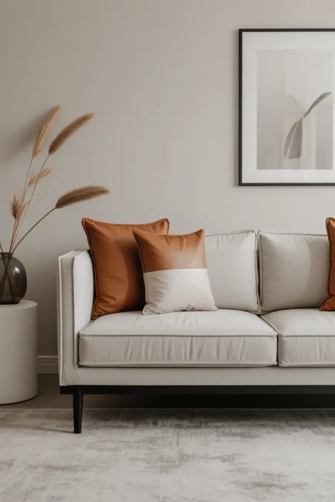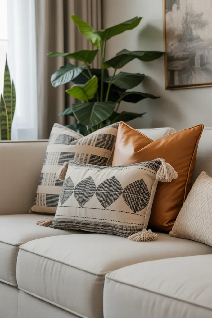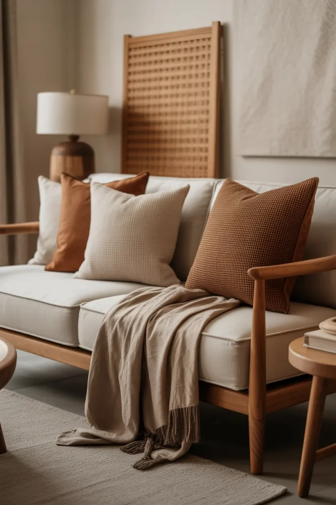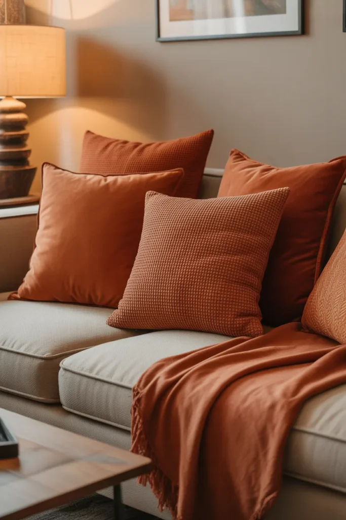Imagine a neutral couch with pillows in burnt orange, muted clay, and a hint of brown. It feels like autumn, even in summer. Honestly, this is one of my favorites for cozy living rooms.