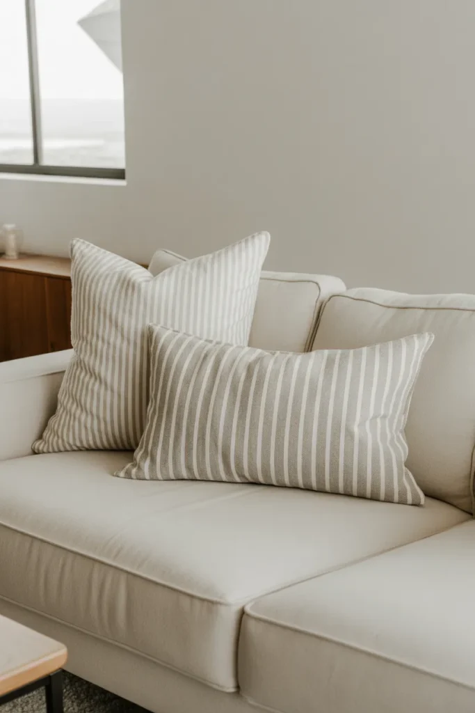 Striped pillows paired with solid ones create instant balance. It feels styled without trying too hard.