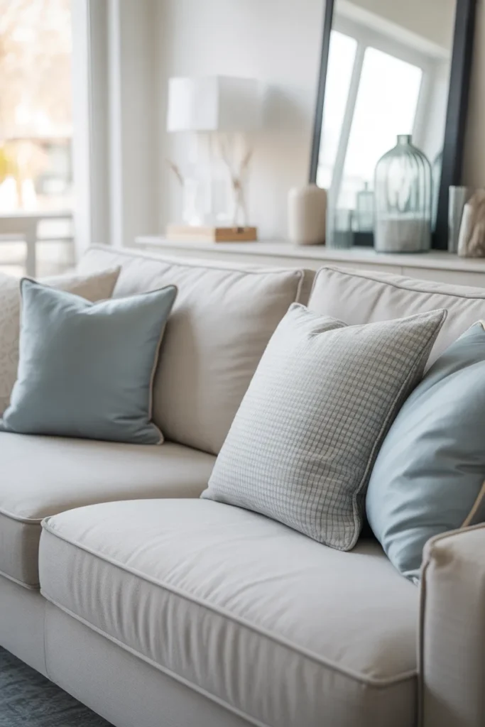 Think soft blue pillows layered with light and medium greys. This combo is perfect for modern spaces or even minimalist setups.