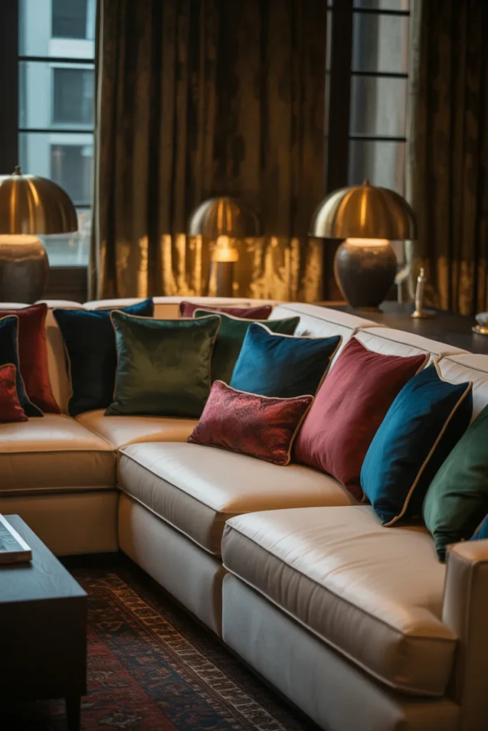 Think emerald, deep blue, or burgundy pillows layered together. Even budget covers look premium in these shades.