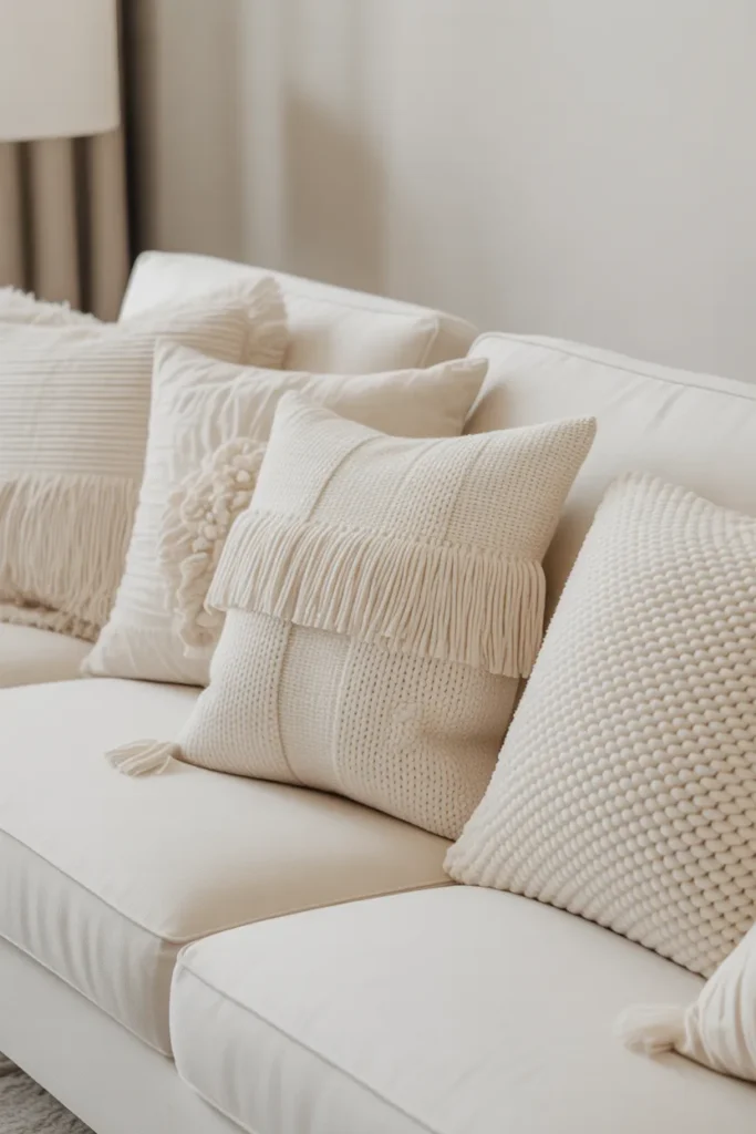 Picture a mix of cotton, fringe, tufted patterns, and soft knits all in white. It creates depth without introducing color. The result feels clean but still interesting.