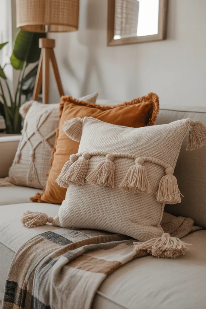 Picture pillows with tassels, woven details, and soft patterns all layered casually. It feels collected over time.