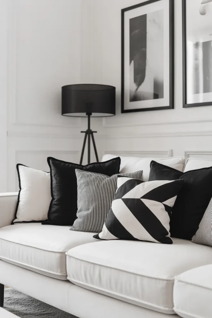 Think white base pillows with thin black stripes or geometric prints. Then layer in a solid black pillow to ground everything. This combo works especially well on light grey or white sofas.