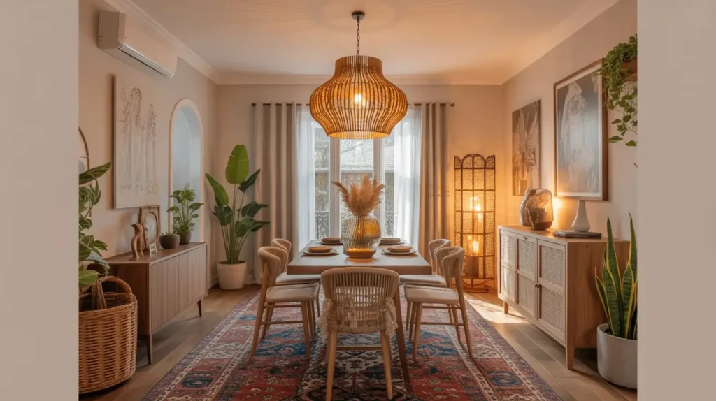 • Materials are Key: Rattan, bamboo, jute, wooden beads, and woven fabrics are the stars of the show. Look for basket-like pendants, beaded chandeliers that drape elegantly, or even macrame-wrapped fixtures.