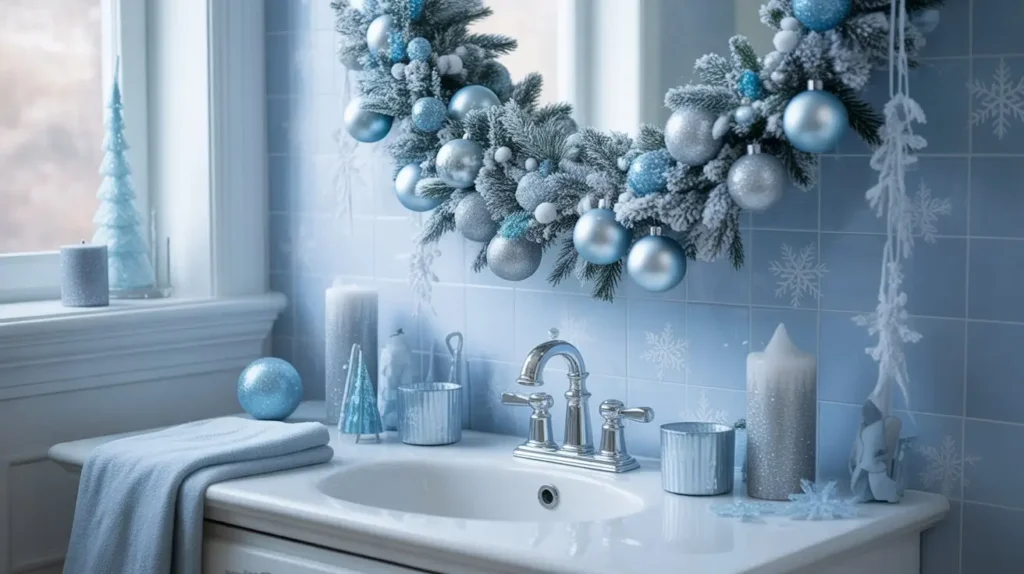 Blue is an underrated Christmas color. It represents the winter sky and ice. If you already have a blue bathroom (tiles or paint), this is the logical choice. It feels cool, crisp, and elegant.