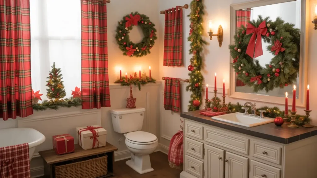 - Red Bows: Tie big red velvet bows on the shower curtain rings or around the sconces.
