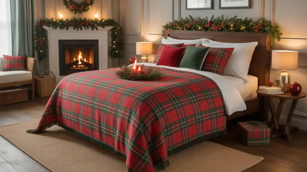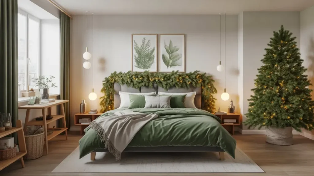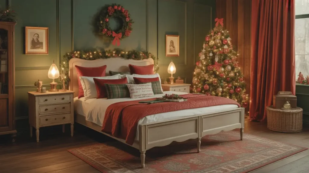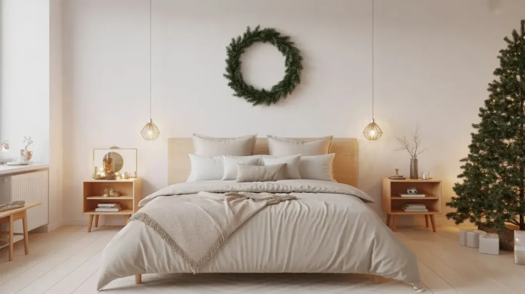 I’ve gathered 15 distinct styles to transform your sanctuary. Whether you want full-blown Santa’s workshop vibes or something that whispers “winter” rather than shouting it, I’ve got you covered. Let’s fix that sad, un-festive bedroom situation right now.