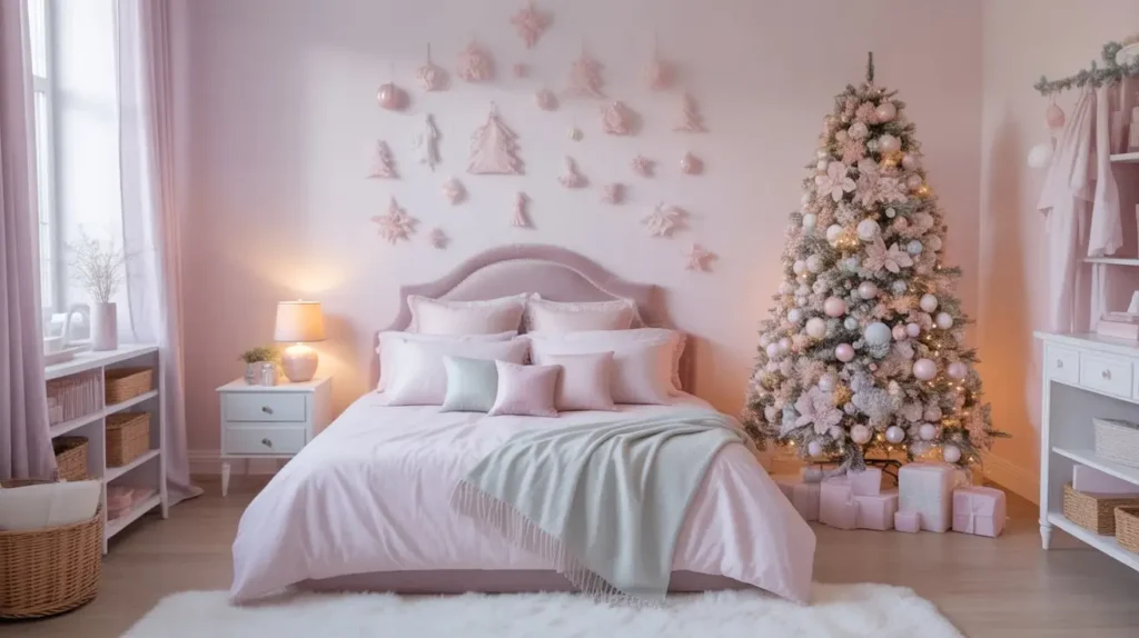 Who says Christmas has to be red and green? If you want your bedroom to look like a jewelry box, go for Pink Glam. This style uses blush tones, rose gold, and plenty of sparkles. It’s unapologetically feminine and fun.