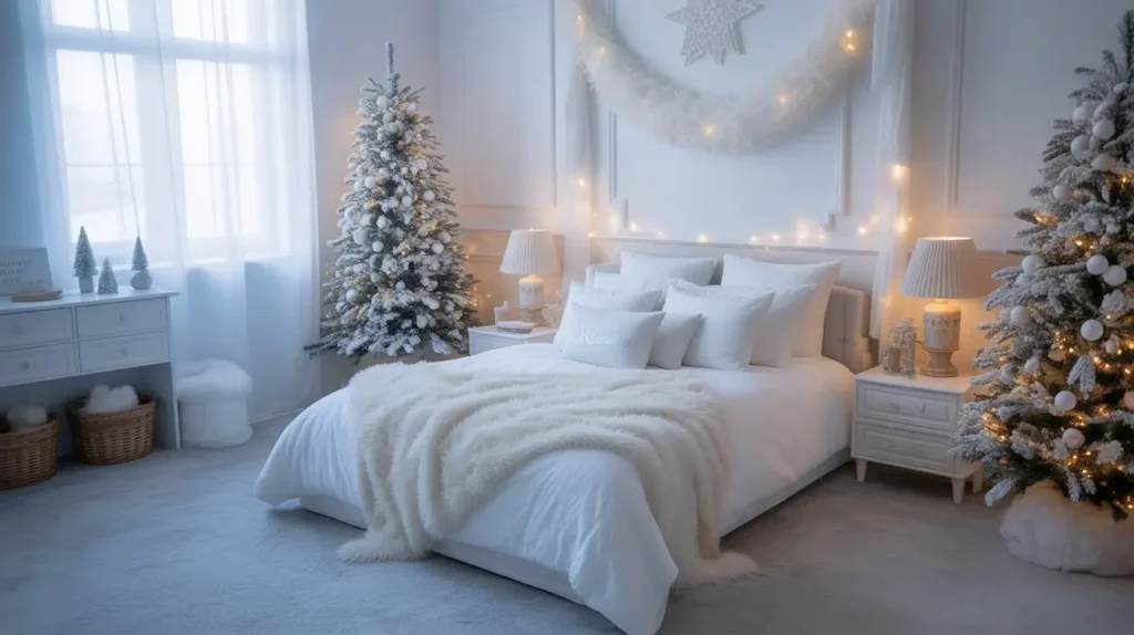 You need to mix your whites. If everything is the exact same shade of bright white, it looks clinical. Mix creamy whites, icy whites, and silver. I use a heavy flocked garland on my headboard for this theme, and it instantly makes the room feel like a snowy forest.