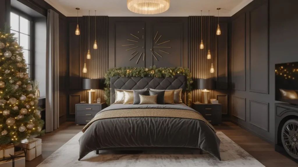 If you wear all black to holiday parties, this is your room aesthetic. It’s moody, dramatic, and sexy. Yes, a Christmas room can be sexy. The high contrast between black elements and warm gold lights creates a sophisticated atmosphere.