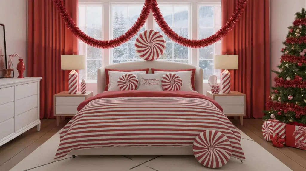 This style proves you don’t need to spend a fortune to have a stunning Christmas decor bedroom.